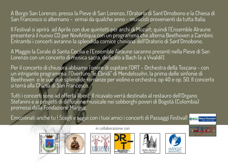 “Passaggi Festival 2017” avrà poi quest’anno una conclusione speciale: arriverà, il 24 maggio nella pieve, l’ORT, l’Orchestra Regionale Toscana, che eseguirà l’Overture Le Ebridi di Mendelsshon la seconda sinfonia di Beethoven e le due splendide Romanze per violino e orchestra op 40 e op 50, ancora di Beethoven.