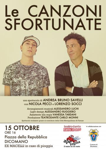 A Dicomano l'apetta porta lo spettacolo di teatro musicale “Le canzoni sfortunate” con Nicola Pecci e Lorenzo Socci, regia di Andrea Bruno Savelli, che, attraverso le emozioni della musica accompagnerà lo spettatore nel confronto tra il professor Ceppi e il suo alunno Pietro, in un dialogo generazionale sui dubbi che attanagliano la vita di ogni uomo scanditi dalle note di Fabrizio De Andrè.