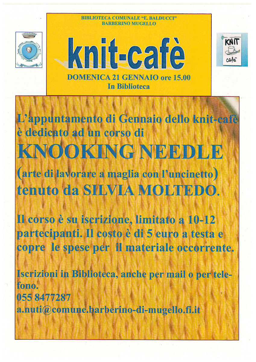 Nei locali della Biblioteca comunale "E. Balducci" di Barberino Mugello in occasione dello knit-cafè di gennaio, si terrà il corso di KNOOKING NEEDLE ( ARTE DI LAVORARE A MAGLIA CON L'UNCINETTO) a cura di Silvia Moltedo.