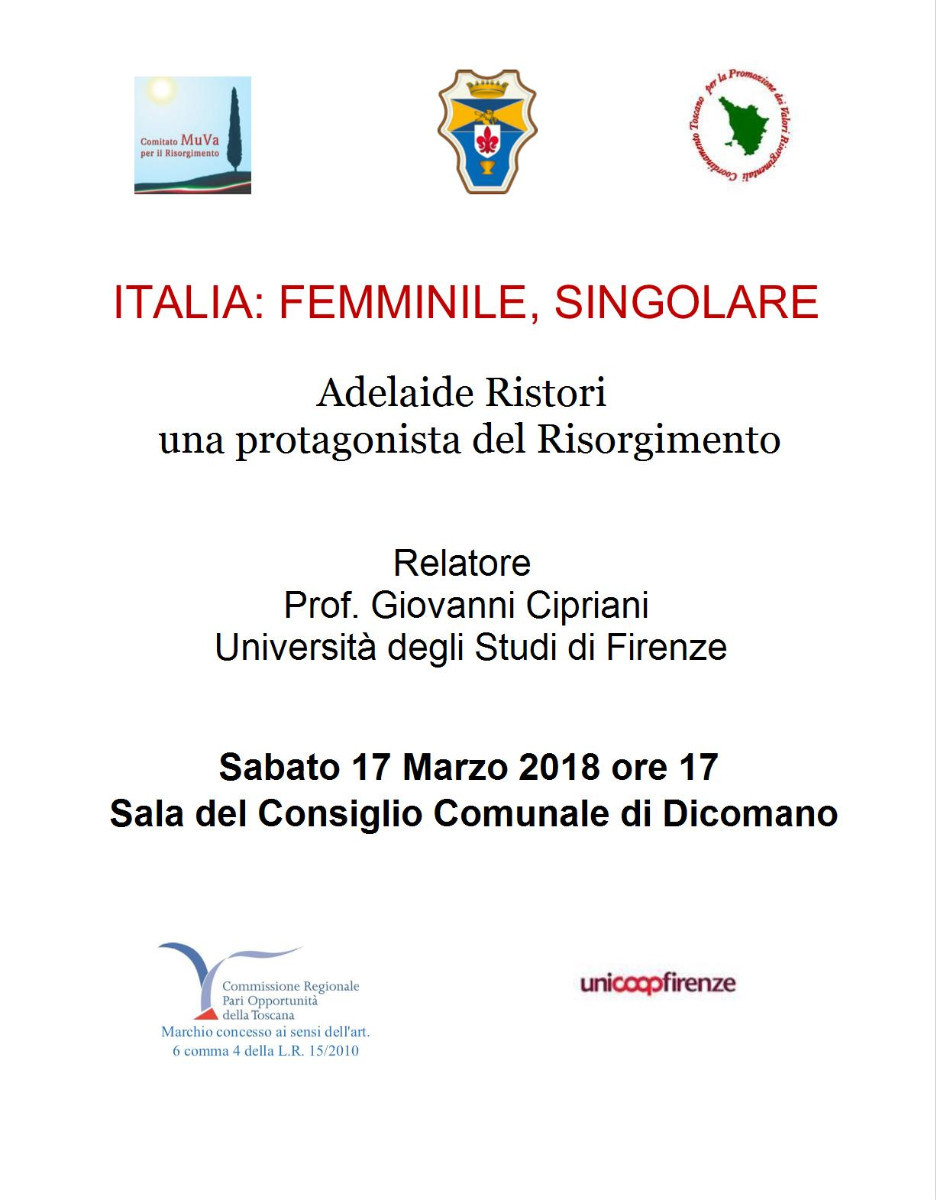 Il 17 marzo, nella ricorrenza dell' anniversario dell' Unità nazionale con la proclamazione nel 1861 del Regno d' Italia, il Prof. Giovanni Cipriani presenta la figura di Adelaide Ristori, celebre attrice dell' Ottocento, che cominciò la sua carriera nella Compagnia Reale Sarda di Torino, sposò il Marchese Capranica del Grillo e viaggiò per  il mondo confermando la sua vocazione per la recitazione e i suoi sentimenti patriottici tanto da meritarsi, tra i complimenti dei moltissimi ammiratori, addirittura le lodi personali di Cavour.
