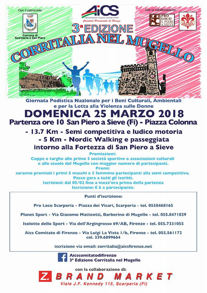 Corritalia è un’occasione importante per sottolineare come lo sport non competitivo possa essere un volano importante per la promozione della Cultura, la valorizzazione e la conoscenza dei Beni culturali, ambientali nei territori di particolare rilevanza storico – culturale. Anche questa edizione in Mugello prevede due percorsi, uno da 13,5 km che si articola intorno ai comuni di Scarperia e San Piero. e una passeggiata da 5 km intorno alla Fortezza di San Martino, consentendo di conoscere meglio uno dei tanti presidi storico-architettonici dei quali l’intero Mugello è ricco.