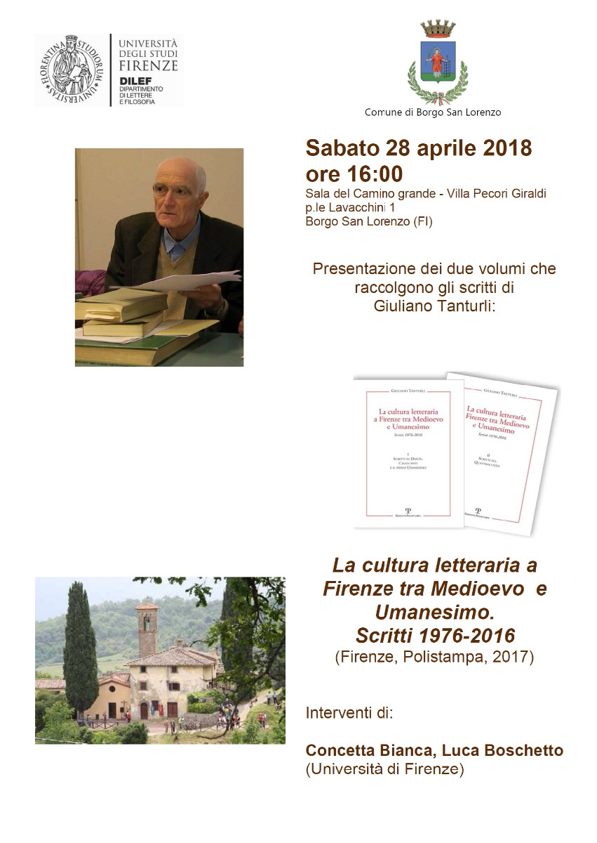 Presentazione dei due volumi che raccolgono gli scritti del prof. Giuliano Tanturli dal titolo La cultura letteraria a Firenze tra Medioevo e Umanesimo. Scritti 1976-2016 (Polistampa, 2017). Interventi di Concetta Bianca e Luca Boschetto dell’Università di Firenze. Ingresso libero.