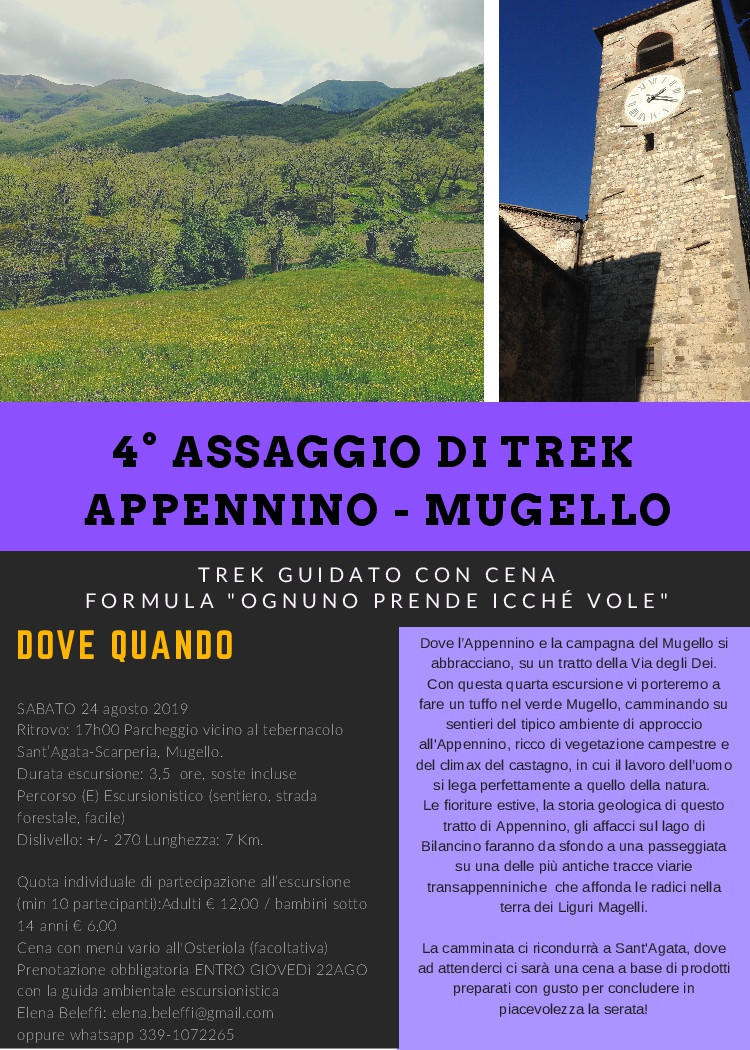 Con questa quarta escursione vi porteremo a fare un tuffo nel verde Mugello, camminando su sentieri e carrarecce nel tipico ambiente di approccio all'Appennino, ricco di vegetazione campestre e del climax del castagno, in cui il lavoro dell’uomo si lega perfettamente a quello della natura. Le fioriture estive, la storia geologica di questo tratto di Appennino, gli affacci sul lago di Bilancino faranno da sfondo a una passeggiata su una delle più antiche tracce viarie transappenniniche che affonda le radici nella terra dei Liguri Magelli.