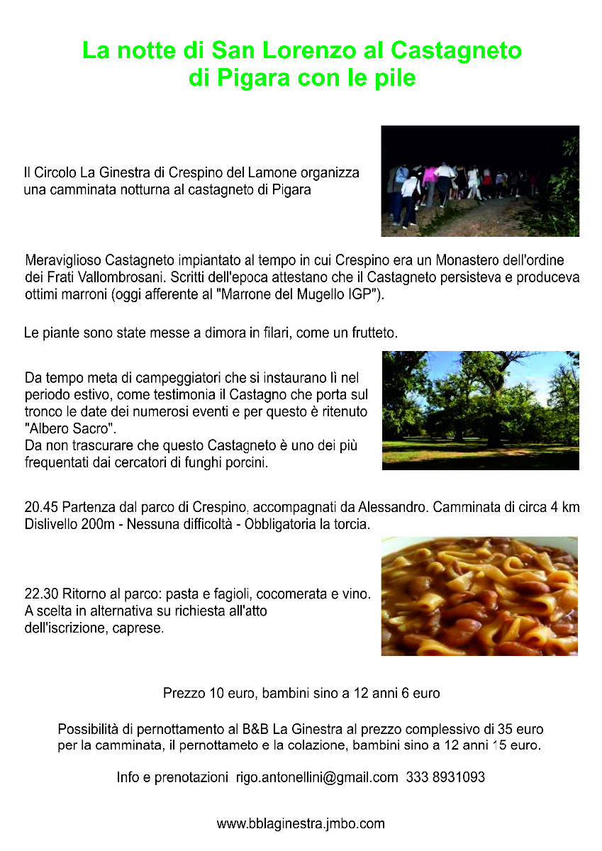 Easy excursion of about 4 km from the park of Crespino sul Lamone till the chestnut forest of Pigara, torch required. Return to the park 10,30 pm and dinner with pasta e fagioli, watermelon and wine.