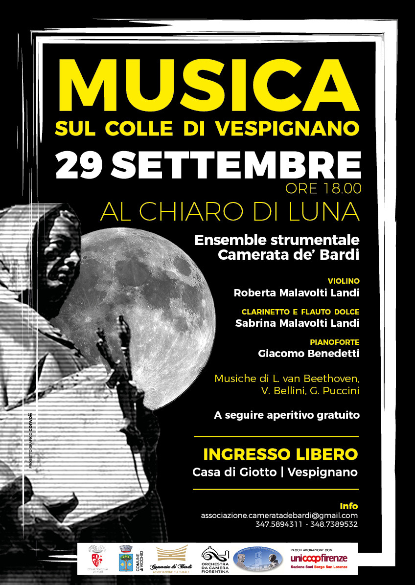 Domenica 29 settembre 2019, alle ore 18.00, presso la Casa di Giotto, sul colle di Vespignano, a Vicchio di Mugello, l'Ensemble strumentale 'Camerata de' Bardi', costituito da Roberta Malavolti Landi al violino, dalla sorella Sabrina ala clarinetto e al flauto dolce, da Giacomo Benedetti al pianoforte, proporrà una serata musicale dedicata alla Luna, nel 50esimo anniversario dall'allunaggio della missione Apollo 11 del 1969.