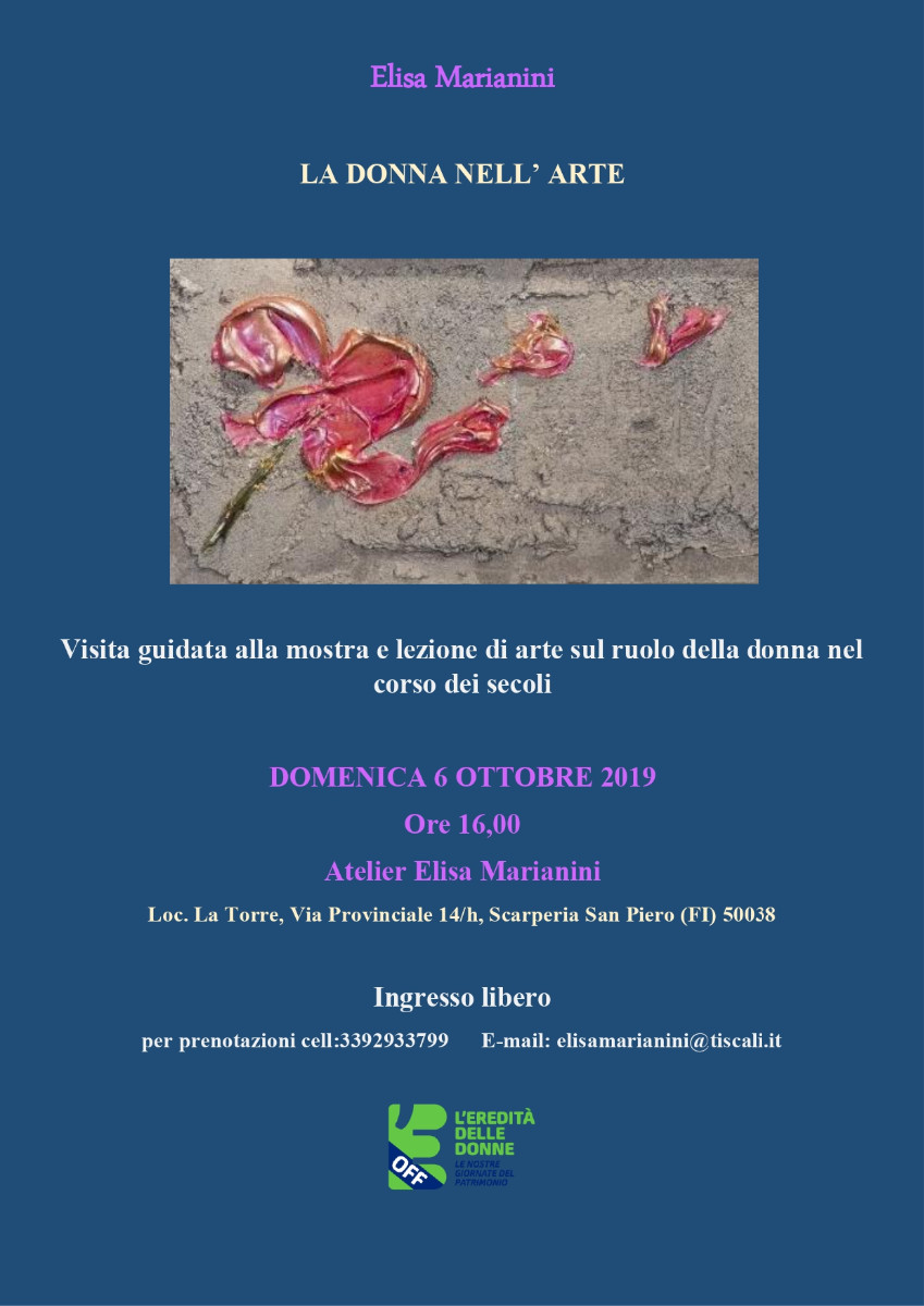 La pittrice e storica dell’arte di Firenze Elisa Marianini propone due incontri nel suo atelier studio: una lezione di storia dell’arte, ad ingresso libero con prenotazione obbligatoria, sul tema “Le donne nell’arte” dove tratterà – attraverso la proiezione di slides – l’avventura artistica e gli ostacoli che molte artiste hanno incontrato nella loro carriera, e una visita guidata alla collezione di dipinti eseguiti della pittrice che espone direttamente in una mostra al suo atelier studio in Mugello, per l’occasione saranno esposte tutte opere rigorosamente legate al tema della donna che l’artista ha creato nel corso di diversi anni.