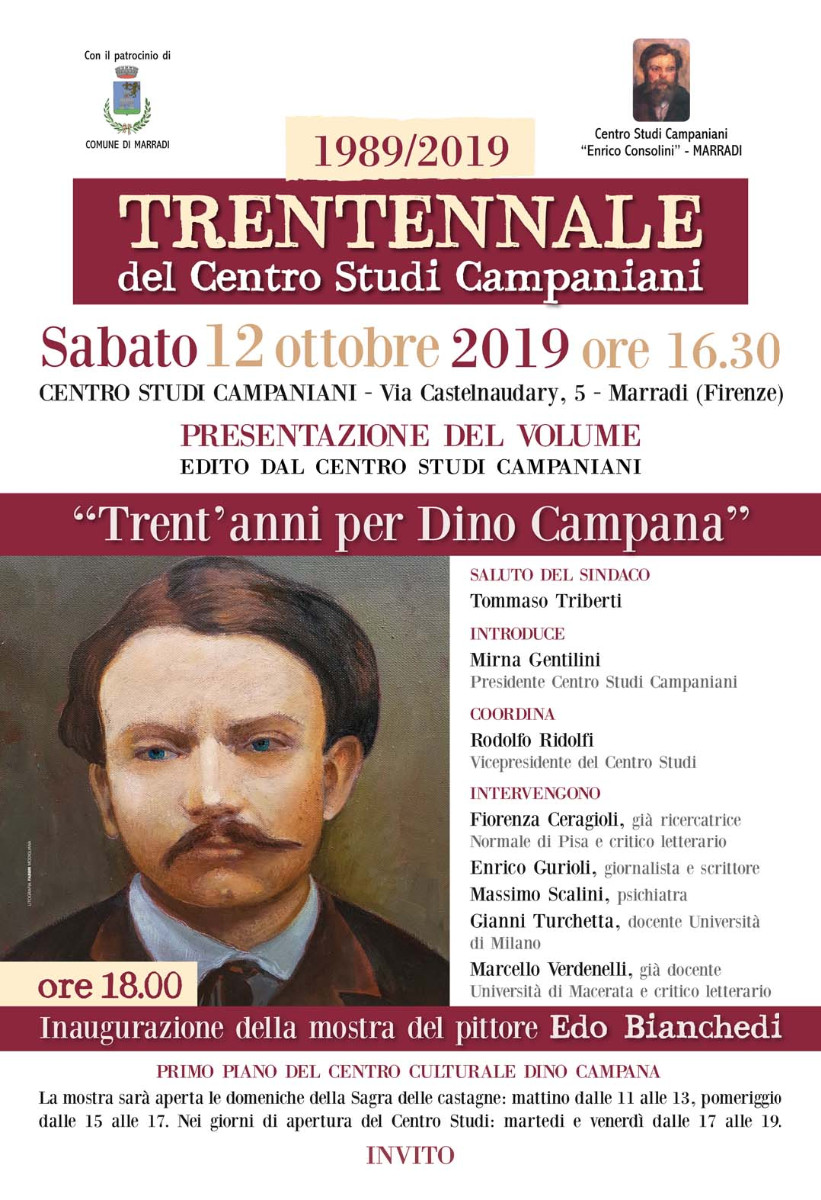 Si terrà sabato 12 ottobre alle 16.30 presso il Centro Studi Campaniani la presentazione del libro “Trent’anni per Dino Campana” alla quale interverranno alcuni dei più importanti studiosi di Dino Campana e della sua opera. L’evento patrocinato dal Comune di Marradi, sarà coordinato da Rodolfo Ridolfi V.Presidente e prevede dopo il saluto del Sindaco gli interventi della Presidente Mirna Gentilini, Fiorenza Ceragioli, Enrico Gurioli, Massimo Scalini, Gianni Turchetta e Marcello Verdenelli .
