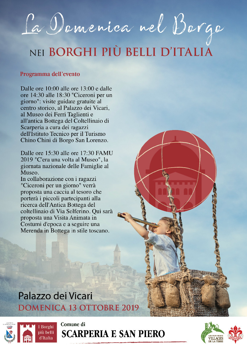 - “La Domenica nel Borgo”, dalle 10 alle 13 e dalle 14:30 alle 18:00: i “Borghi più belli d’Italia”, e quindi anche Scarperia, apriranno le loro porte per accogliere migliaia di visitatori nei centri storici, musei, chiese, palazzi e monumenti animando l’intera giornata. Guide d’eccezione saranno i ragazzi delle scuole “Ciceroni per un giorno” con visite guidate gratuite alla scoperta dei luoghi straordinari presenti nel borgo. Centro storico del paese, Palazzo dei Vicari, Museo dei Ferri Taglienti e Bottega del Coltellinaio saranno i protagonisti.