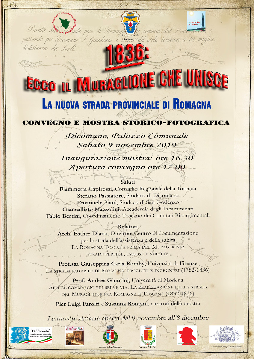 “1836 : ecco il Muraglione che unisce , la nuova strada provinciale di Romagna” questo il tema della mostra e del convegno. L’inaugurazione alle 16,30 di sabato 9 novembre nel palazzo comunale di Dicomano a cui seguirà il convegno aperto dai saluti dei sindaci di Dicomano Passiatore e San Godenzo Piani, della consigliera regionale Capirossi, di Giancallisto Mazzolini dell’Accademia degli Incamminati e di Fabio Bertini del Coordinamento toscano dei comitati risorgimentali.