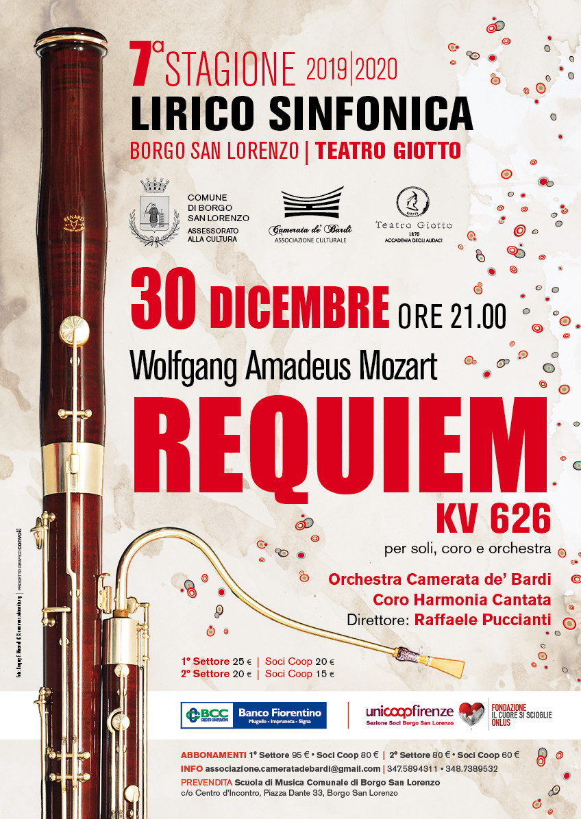 Il cartellone si apre lunedì 30 dicembre 2019, alle ore 21:00, giornata istituzionale per la 76esima commemorazione delle vittime del bombardamento del 1943. L’Orchestra Camerata de’ Bardi insieme al Coro Harmonia Cantata e le voci soliste di Patrizia Cigna (soprano), Patrizia Scivoletto (alto), Vladimir Reutov (tenore) e Diego Colli (basso), diretti dal Maestro Raffaele Puccianti, eseguiranno l’ultimo capolavoro del genio salisburghese Wolfgang Amadeus Mozart, il Requiem per soli, coro e orchestra K 626. In Biblioteca è possibile visionare il programma completo della stagione.