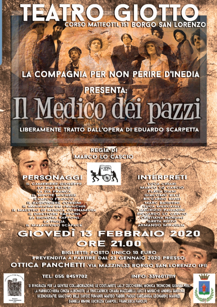 Sul palco del Teatro Giotto di Borgo San Lorenzo, giovedì 13 febbraio alle ore 21:00, la compagnia "Per non perire d'inedia" porterà in scena Il medico dei pazzi, commedia brillante in due atti liberalmente tratta dall’omonima farsa di Eduardo Scarpetta. Regista Marco Lo Cascio. Una serata da non perdere, patrocinata dal Comune, e organizzata per raccogliere fondi da destinare al restauro dell'Organo Stefanini.