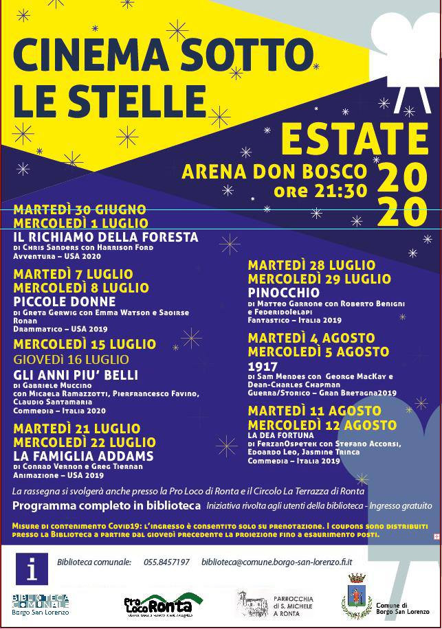 Da martedì 30 giugno parte la stagione 2020 del “Cinema sotto le Stelle” la rassegna cinematografica di proiezioni gratuite all’aperto organizzata dal Comune in collaborazione con la Parrocchia di Borgo San Lorenzo, la Pro Loco di Ronta e il Circolo La Terrazza di Ronta. Sarà un’edizione particolare, poiché il rispetto delle disposizioni di contenimento dell’epidemia Covid19 renderà necessario adottare una serie di misure specifiche, tra cui la riduzione del numero massimo di spettatori e il distanziamento fisico all’interno degli spazi di proiezione. Per questo motivo l’accesso all’Arena Don Bosco sarà su prenotazione, attraverso il rilascio di voucher presso la Biblioteca Comunale. La prima proiezione è prevista all’Arena Don Bosco martedì 30 giugno, in replica mercoledì 1 luglio, alle ore 21:30, col film “Il richiamo della foresta” di Chris Sanders c on Harrison Ford (Avventura – USA 2020). I voucher possono essere ritirati in Biblioteca, in orario di apertura, a partire dal giovedì precedente la proiezione, fino a esaurimento posti: lunedì 14-18, martedì 9-13, mercoledì 9-13, giovedì 14-18, sabato 9-13.