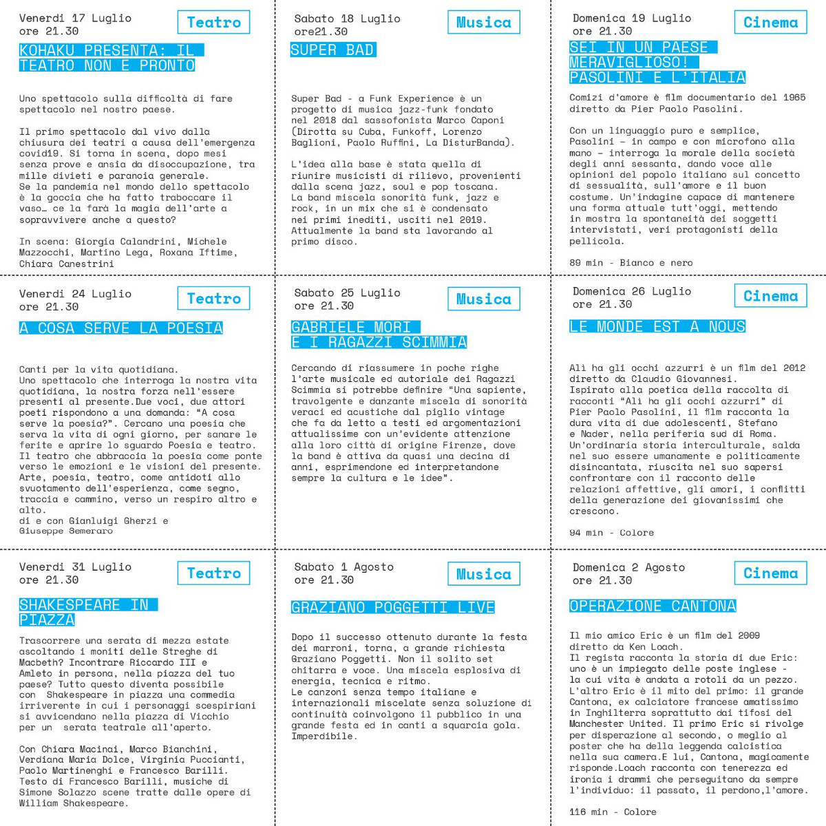 Tre fine settimana di iniziative artistico-culturali e di utilizzo della piazza, intesa come lo spazio fisico in cui accadono gli eventi della comunità̀.