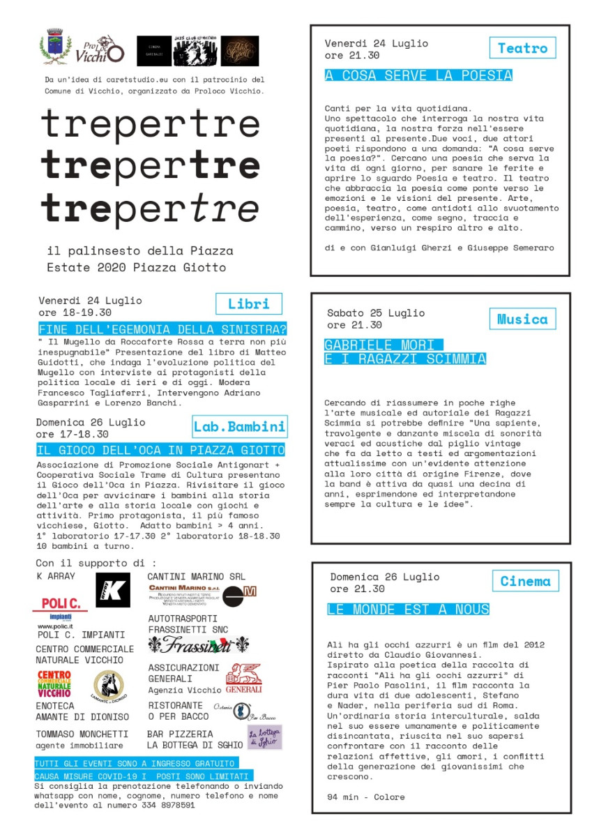 Trepertre sono 3 fine settimana di eventi organizzati a Vicchio sulla “piattaforma” Piazza Giotto; trepertre sono tante attività̀ organizzate in collaborazione con differenti partner con l’obiettivo di stimolare una riflessione sulla centralità dello spazio pubblico; trepertre sono 3 formati diversi di utilizzo della piazza.