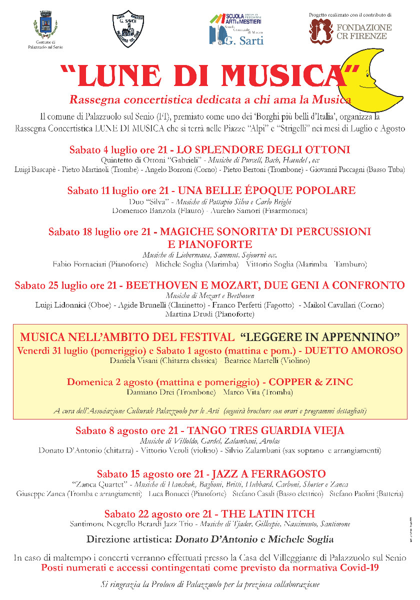 Sabato 22 AGOSTO alle ore 21.00 nella Piazza Strigelli di Palazzuolo sul Senio (FI) si terrà l’ultimo appuntamento di “LUNE DI MUSICA” rassegna concertistica dedicata a chi ama la Musica