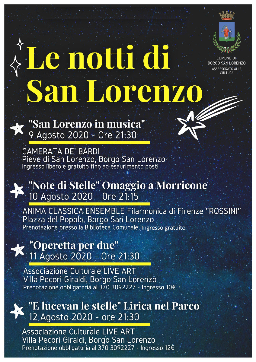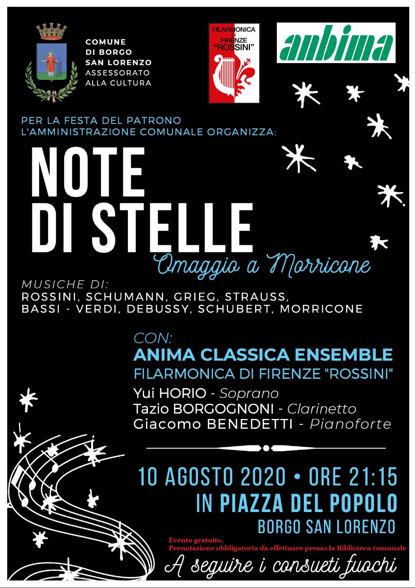 10th/08, "Note di stelle" - dedicated to Morricone. Anima classica Ensemble, Filarmonica di Firenze Rossini, Piazza del Popolo, Borgo San Lorenzo. Info: 055 8457197
