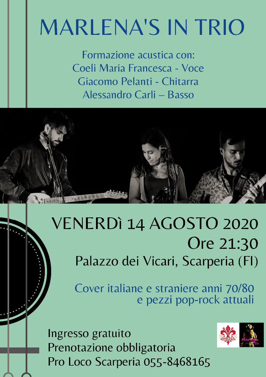 Nell’atrio del Palazzo si esibiranno i MARLENA'S IN TRIO, formazione acustica con Coeli Maria Francesca – Voce, Giacomo Pelanti – Chitarra e Alessandro Carli – Basso, che proporranno Cover italiane e straniere anni 70/80 e pezzi pop-rock attuali. Alleghiamo locandina.