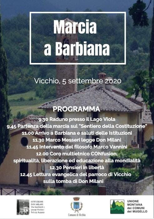 L'Istituzione comunale Don Milani e Scuola di Barbiana insieme al comune di Vicchio e con il patrocinio dell’Unione montana dei comuni del Mugello organizza sabato 5 settembre la marcia a Barbiana, iniziativa che si sarebbe dovuta tenere a maggio, cancellata a causa del lockdown.