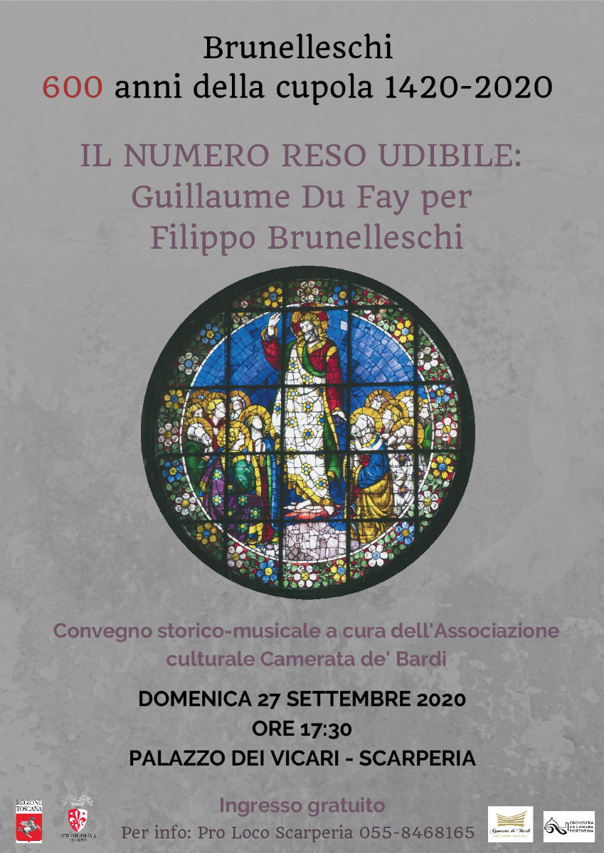 “Il numero reso udibile, Guillaume Du Fay per Filippo Brunelleschi”: in occasione della mostra fotografica “Brunelleschi 600 anni della cupola 1420-2020”, Convegno storico-musicale a cura dell'Associazione culturale Camerata de' Bardi nel Salone dei Tendaggi del Palazzo.