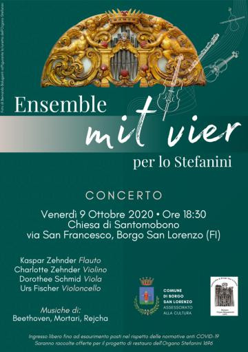Si terrà nell'Oratorio di Santomobono il concerto dell'ensemble di musica da camera tedesco Mit Vier, venerdì 9 ottobre alle ore 18:30. Kaspar Zehnder al flauto, Charlotte Zehnder al violino, Dorothee Schmid alla viola e Urs Fisher al violoncello eseguiranno un programma con musiche di Ludwig van Beethoven e dei compositori Virgilio Mortari e Antonin Rejcha.