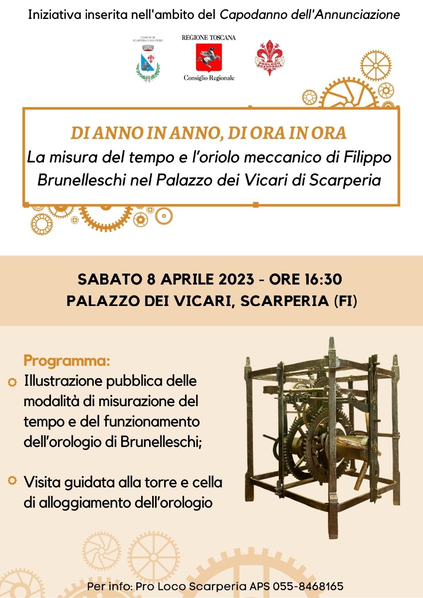 On the occasion of the New Year celebrations of the Annunciation, we remind you of the appointment on Saturday, April 8th at 4:30 pm with the event "From year to year, from hour to hour - the measure of time and the mechanical oriole of Filippo Brunelleschi at the Palazzo dei Vicari"