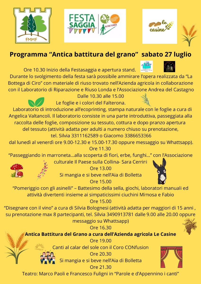 From 4.30 p.m. the highlights of the day: wheat threshing using the traditional method, singing at sunset with the CONfusion choir, and finally, after dinner, "Parole e d'Appennino i canti" theatre with Marco Paoli and Francesco Fuligni.