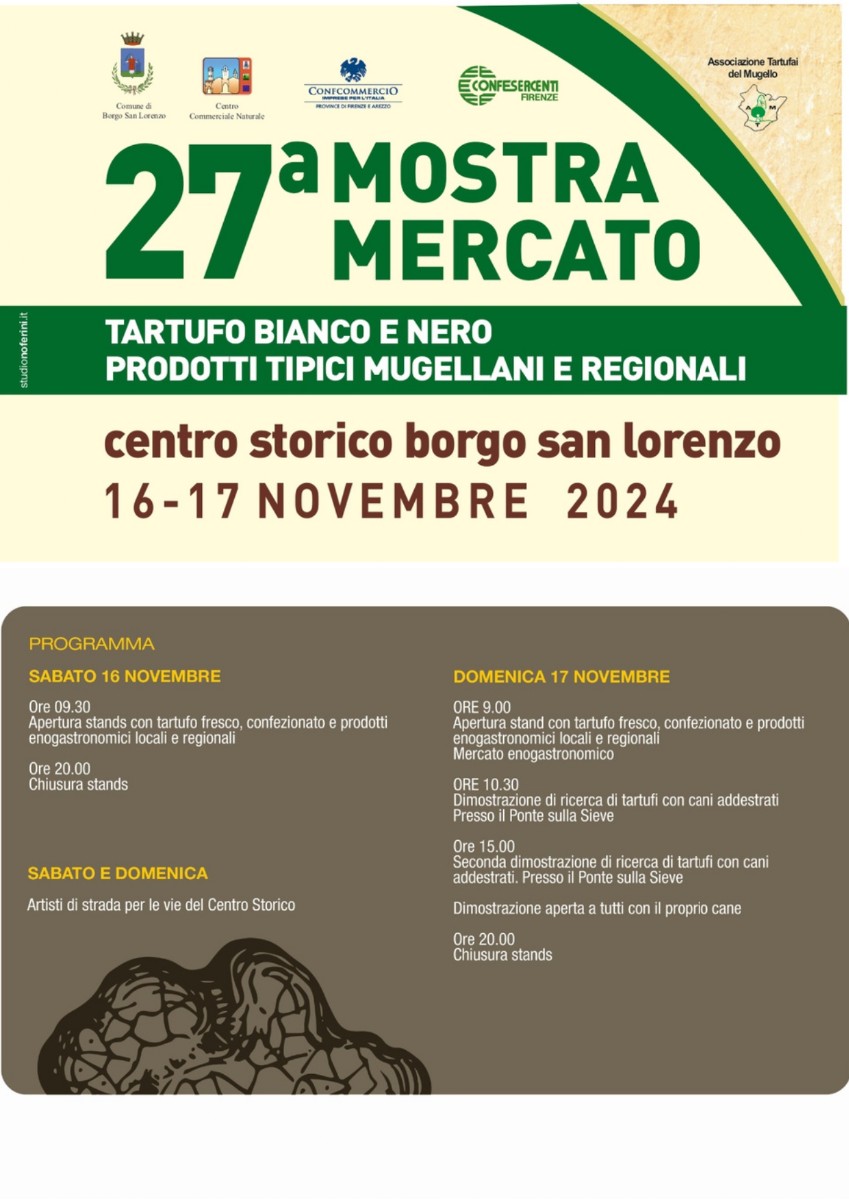 The event will see the historic centre of Borgo San Lorenzo as its beating heart: Piazza Garibaldi will in fact be the fulcrum of the event, with the presence of the stand of the Associazione Tartufai del Mugello (Mugello Truffle Hunters' Association), which will offer local truffles for sale and provide information on this highly prized local product. In the streets of the historic centre, there will then be exhibition spaces for food and wine products, in particular those of Mugello farms that will offer the fruits of autumn, a particularly rich month in Mugello. And finally, during the days of the event, an agreement with bars and restaurants in the historic centre will allow visitors to taste snacks and dishes based on the local truffle. During the two days, there will also be events that will tell the world of truffles, such as two demonstrations with truffle dogs, which will be held at 10.30 a.m. and 3 p.m. at the bridge over the Sieve, in one of the controlled truffle grounds managed by the Mugello Truffle Hunters' Association, easily accessible to all. And in the afternoon, the demonstration will be open to anyone with a truffle dog. Finally, on both Saturday and Sunday, street artists will perform in the streets of the historic centre.