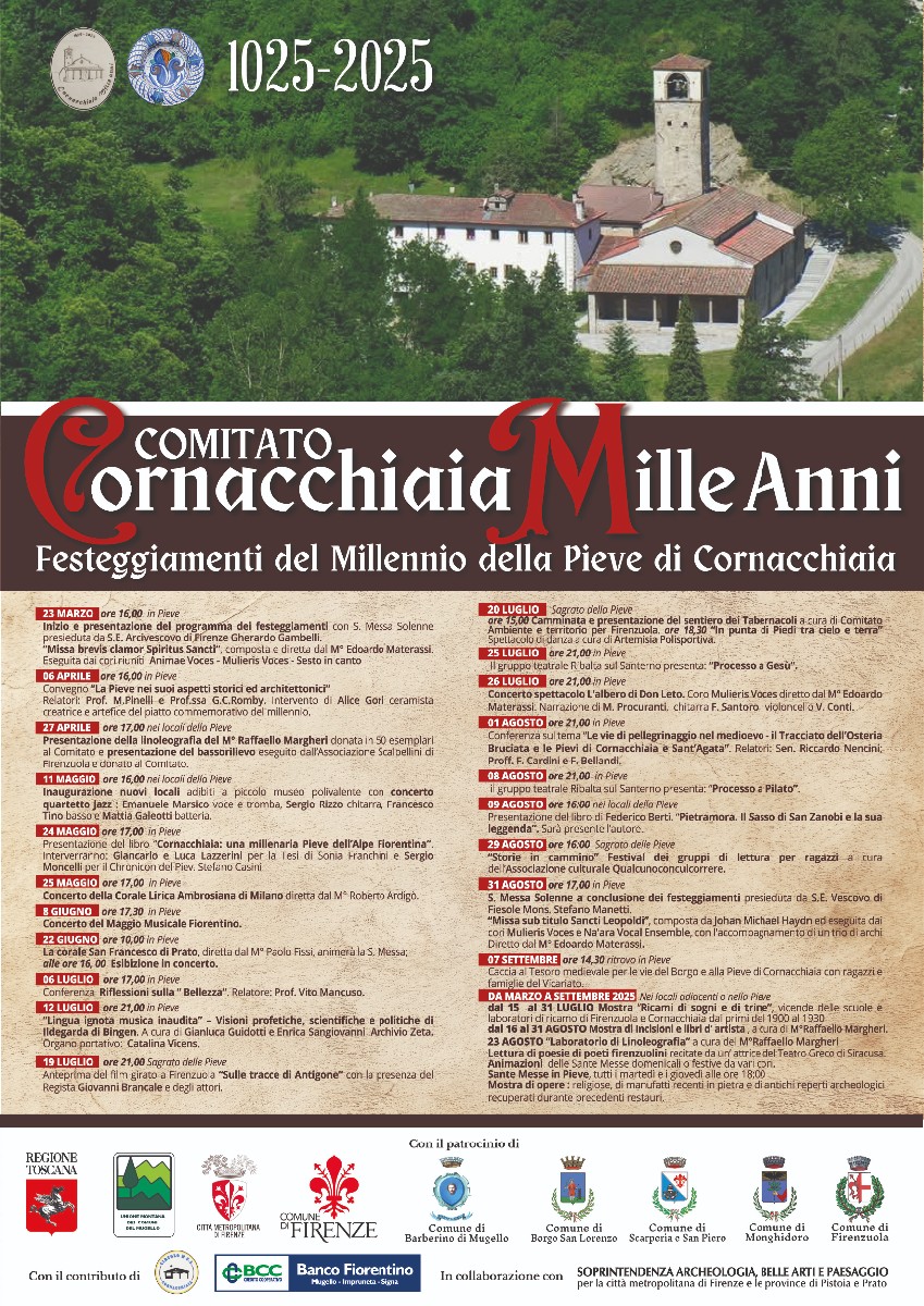 A number of conferences on the history, architecture and art of Cornacchiaia and its village have been scheduled, with talks by scholars of the history of the area such as: Marco Pinelli, Giuseppina Carla Romby, Riccardo Nencini, Franco Cardini and Filippo Bellandi. There will be numerous concerts, including those of the Ambrosiana Chorale of Milan, the San Francesco Chorale of Prato, the Maggio Musicale Fiorentino and, of course, our Mulieris Voces, which will animate the solemn Masses at the beginning and end of the festivities. The Zeta Archive will put on an exclusive show for the Millennium. There will also be theatre performances, exhibitions and book presentations. The Comitato Ambiente e Territorio per Firenzuola (Environment and Territory Committee for Firenzuola) will arrange and mark the Sentiero dei Tabernacoli (Path of Tabernacles), an interesting route around the parish church. Some days will be dedicated to sports activities and games for children and young people.