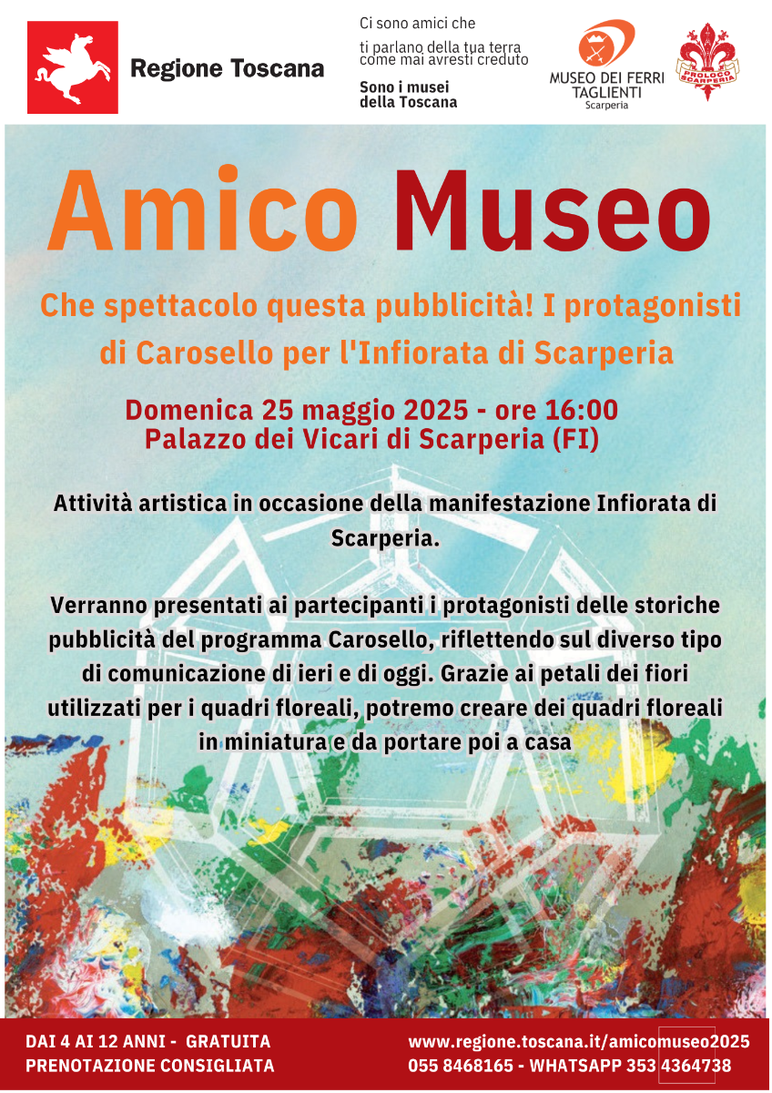 Laboratorio artistico in occasione della manifestazione Infiorata di Scarperia. Verranno presentati ai partecipanti i protagonisti delle storiche pubblicità del programma Carosello, riflettendo sul diverso tipo di comunicazione di ieri e di oggi.