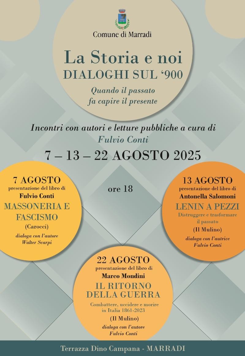 • 7 agosto: Fulvio Conti presenta il suo libro Massoneria e fascismo (Carocci), in dialogo con Walter Scarpi.