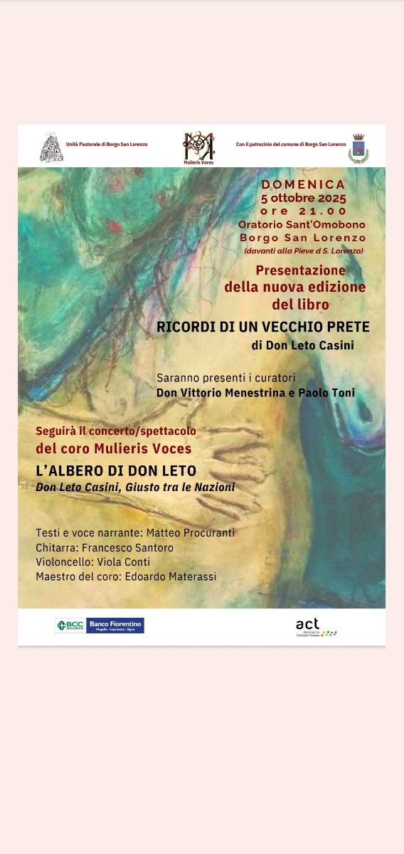 Domenica 5 ottobre 2025 alle ore 21:00, presso l’Oratorio Sant’Omobono di Borgo San Lorenzo, si terrà la presentazione della nuova edizione del libro Ricordi di un vecchio prete di Don Leto Casini, con la partecipazione dei curatori Don Vittorio Menestrina e Paolo Toni.