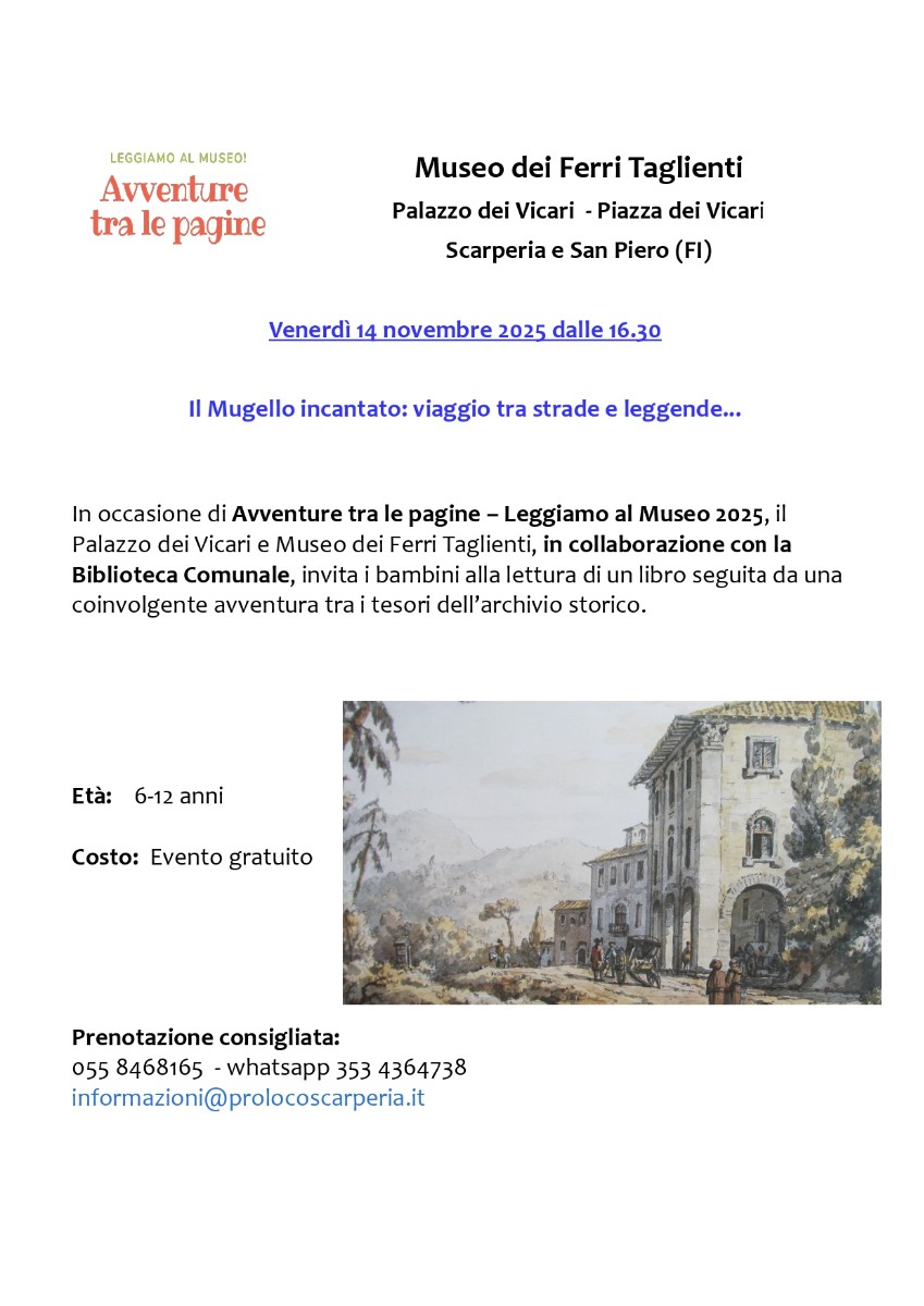 In occasione di Avventure tra le pagine – Leggiamo al Museo 2025, il Palazzo dei Vicari e Museo dei Ferri Taglienti, in collaborazione con la Biblioteca Comunale, invita i bambini alla lettura di un libro seguita da una coinvolgente avventura tra i tesori dell’archivio storico.