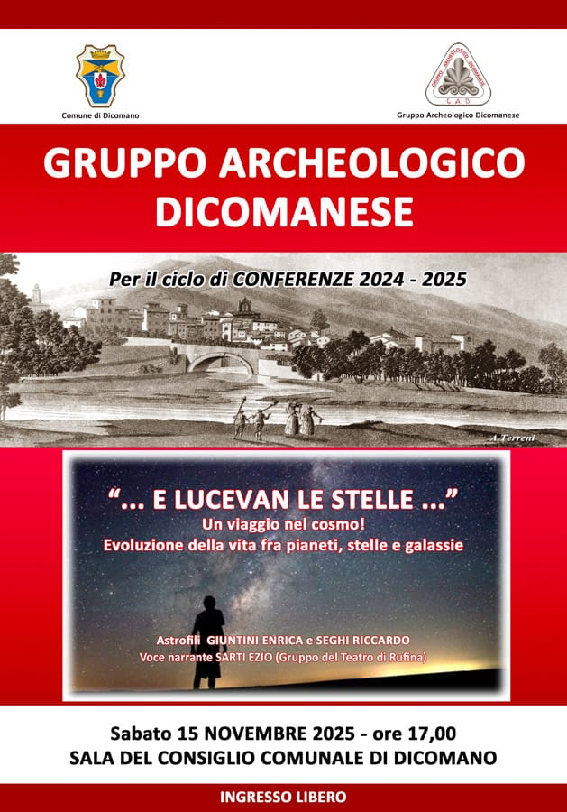 Il Gruppo Archeologico DicomAnese, con il patrocinio del Comune di Dicomano, presenta un nuovo appuntamento del ciclo di conferenze 2024-2025. Un’affascinante serata dedicata all’astronomia e alla scoperta dell’universo, tra scienza e poesia del cielo stellato.