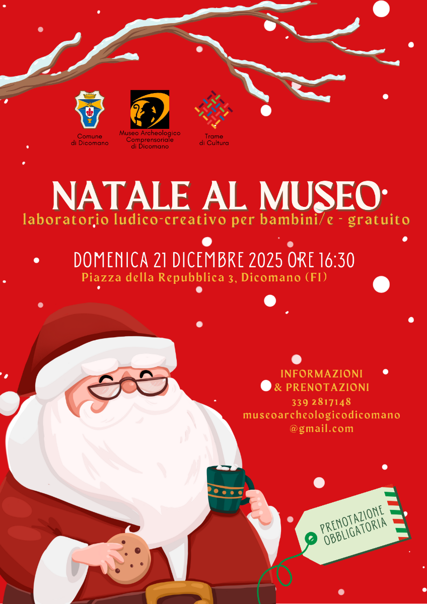 L’iniziativa è organizzata dal Comune di Dicomano, dal Museo Archeologico e dal progetto Trame di Cultura, e propone un pomeriggio di gioco, creatività e atmosfera festiva, accompagnato da una simpatica immagine di Babbo Natale, simbolo del periodo.