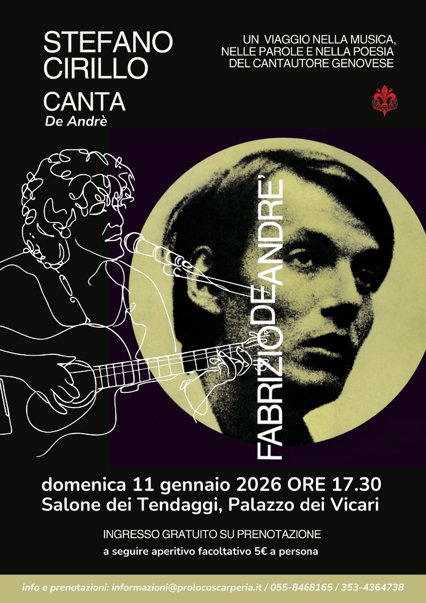 Domenica 11 gennaio 2026, alle ore 17:30, il Salone dei Tendaggi di Palazzo dei Vicari ospiterà “Stefano Cirillo canta De André”, un evento dedicato agli appassionati dell’opera di Fabrizio De André.