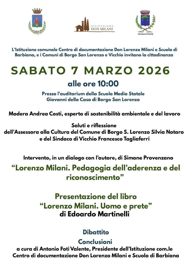 L'Istituzione comunale Centro di documentazione Don Lorenzo Milani e Scuola di Barbiana, insieme ai Comuni di Borgo San Lorenzo e Vicchio, invita la cittadinanza a un importante momento di riflessione dedicato alla figura e all'eredità educativa di Don Lorenzo Milani.