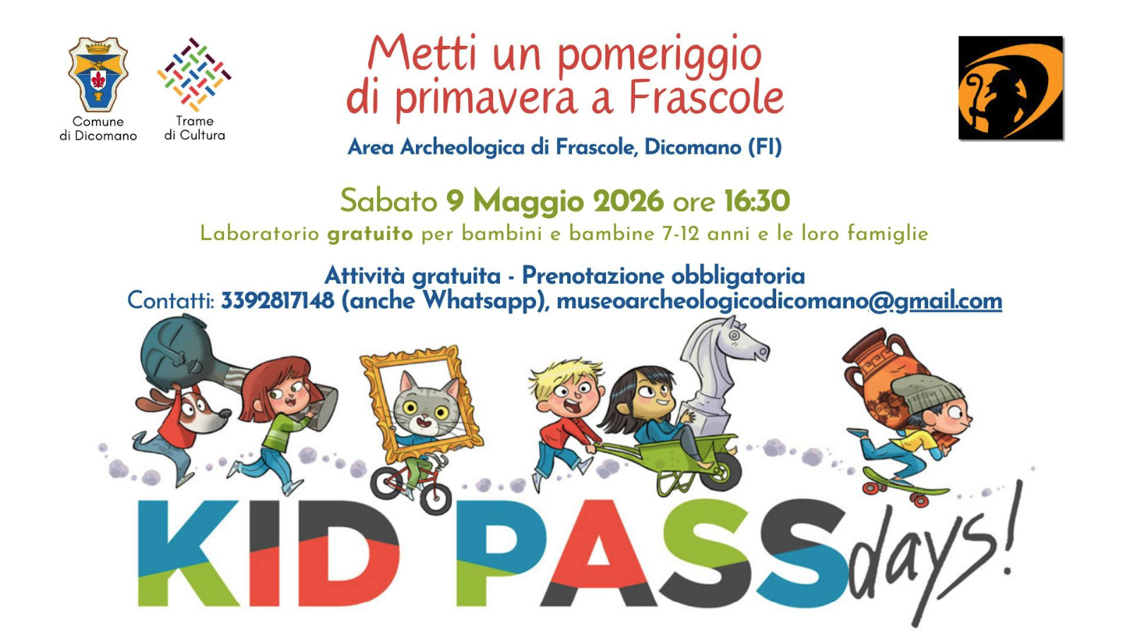 For Kid Pass Days 2026, the Dicomano Archaeological Museum is moving to Frascole, specifically to the archaeological area overlooking Dicomano and its surroundings, a reminder that this area has been inhabited for a very long time! The activity—designed for boys and girls aged 7 to 12—will take place entirely outdoors and will allow young participants to learn about the cultures that have inhabited the Frascole hills over the centuries, as well as the profession of archaeologist and some curiosities related to ancient games. The activity is free and will last approximately one hour. We recommend wearing seasonal clothing and closed-toe shoes. A hat with a visor and sunscreen are recommended. In case of inclement weather, the event will be canceled.