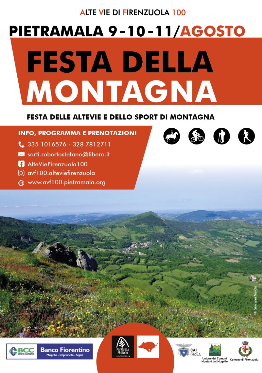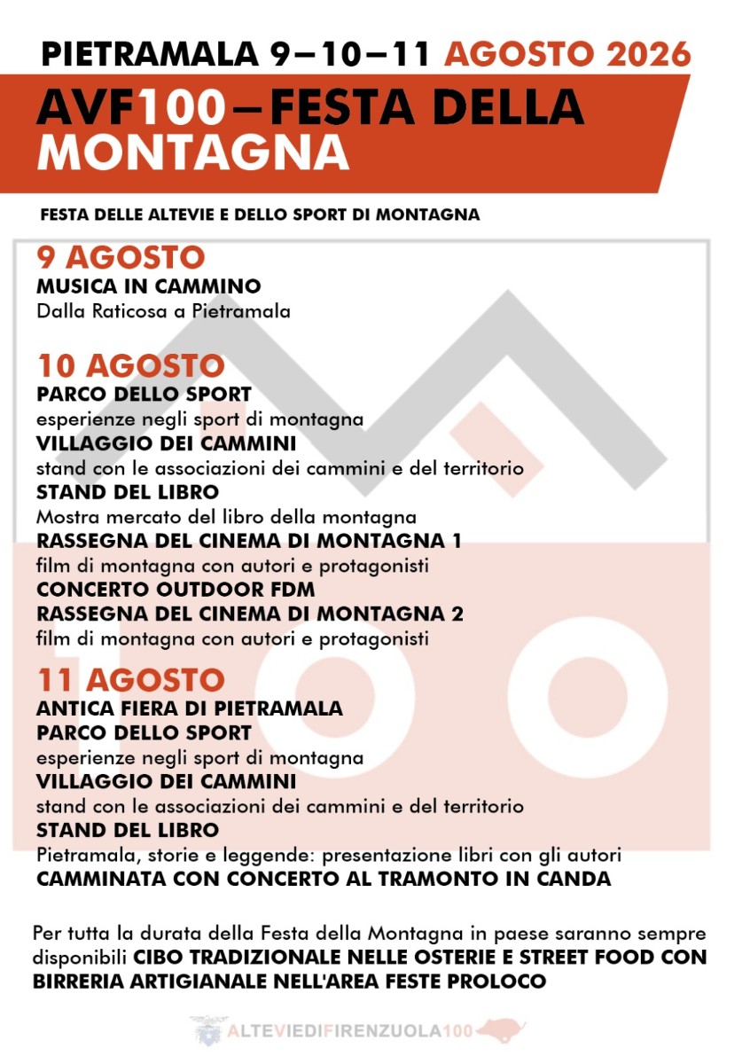 Dal 9 all’11 agosto 2026, il borgo di Pietramala (Firenzuola) ospita AVF100 – Festa della Montagna, l’evento che celebra le Alte Vie di Firenzuola e la cultura della montagna con un ricco programma di attività, incontri ed esperienze per tutti.