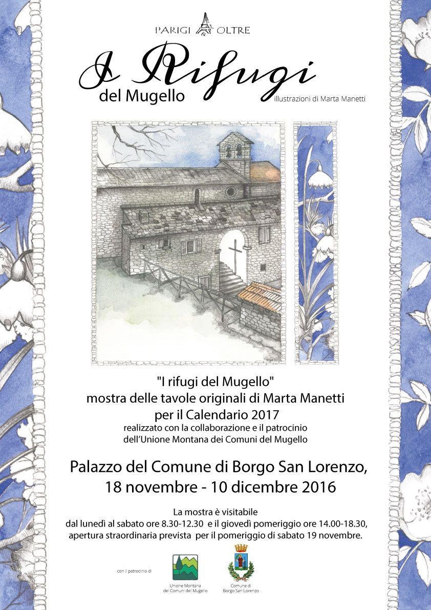Sarà visitabile da venerdì 18 novembre presso il Palazzo comunale di Borgo San Lorenzo la mostra “I Rifugi del Mugello”. In esposizione le tavole originali di Marta Manetti realizzate per il Calendario 2017. L’allestimento resterà visibile fino al 10 dicembre dal lunedì al sabato in orario 8,30-12,30 e il giovedì pomeriggio dalle 14,00 alle 18,30.