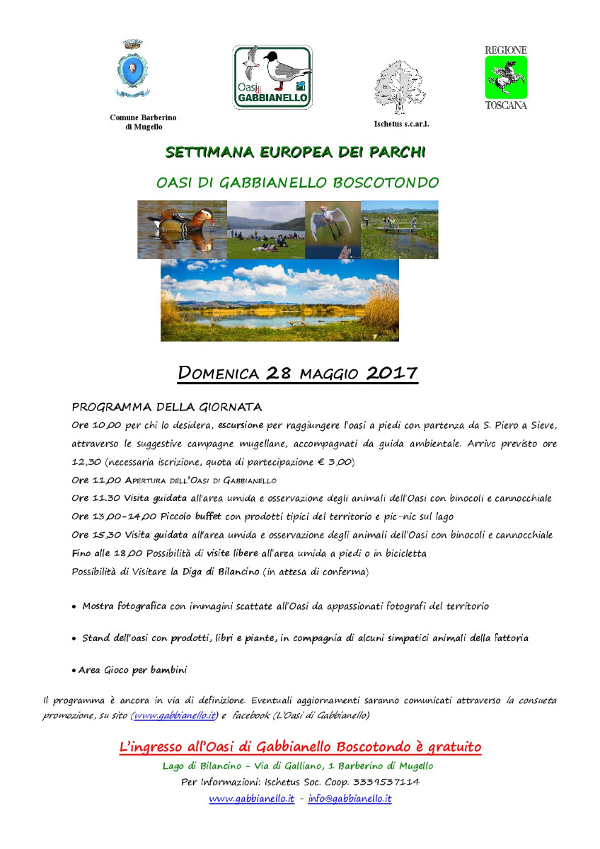 Ore 10,00 per chi lo desidera, escursione per raggiungere l’oasi a piedi con partenza da S. Piero a Sieve, attraverso le suggestive campagne mugellane, accompagnati da guida ambientale. Arrivo previsto ore 12,30 (necessaria iscrizione, quota di partecipazione € 3,00. )Ore 11,00 Apertura dell’Oasi di Gabbianello. Ore 11.30 Visita guidata all'area umida e osservazione degli animali dell’Oasi con binocoli e cannocchiale. Ore 13,00-14,00 Piccolo buffet con prodotti tipici del territorio e pic-nic sul lago. Ore 15,30 Visita guidata all'area umida e osservazione degli animali dell’Oasi con binocoli e cannocchialeFino alle 18,00 Possibilità di visite libere all’area umida a piedi o in biciclettaPossibilità di Visitare la Diga di Bilancino (in attesa di conferma)· Mostra fotografica con immagini scattate all’Oasi da appassionati fotografi del territorio· Stand dell’oasi con prodotti, libri e piante, in compagnia di alcuni simpatici animali della fattoria· Area Gioco per bambiniIl programma è ancora in via di definizione. Eventuali aggiornamenti saranno comunicati attraverso la consueta promozione, su sito (www.gabbianello.it ) e facebook (L’Oasi di Gabbianello)