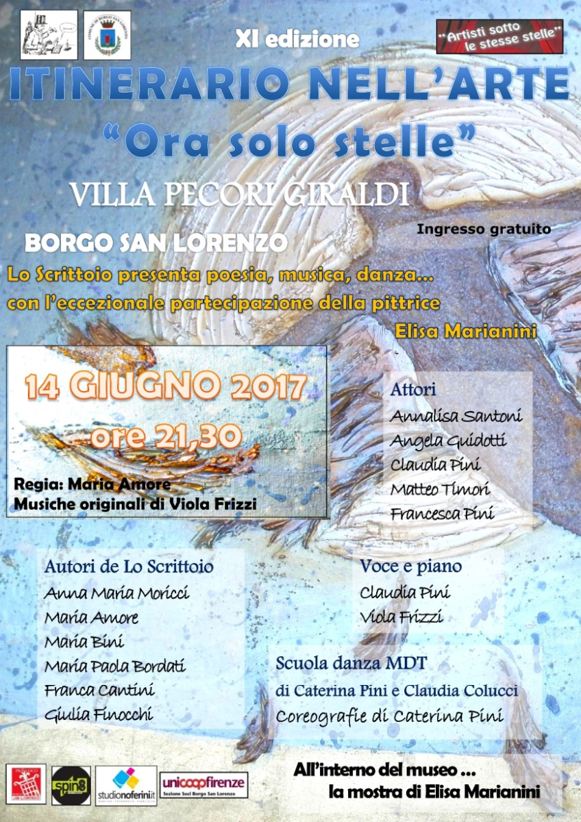 XI edizione di “Itinerario nell’arte …”, serata di poesie, arte, musica e danza curata dall’Associazione Culturale Lo Scrittoio. Organizzata da sempre intorno al solstizio d'estate, rientra nella 2° edizione di “Artisti sotto le stesse stelle”, rassegna teatrale estiva che si svolgerà il giorno 14 giugno alle ore 21.30 nel parco di Villa Pecori Giraldi di Borgo San Lorenzo. Quest’anno lo spettacolo dal titolo “Ora solo stelle” trae ispirazione da un'opera appositamente creata dalla pittrice Elisa Marianini per la serata e con l’occasione sarà inaugurata la mostra personale all’interno della sala degli stemmi della villa Pecori Giraldi che rimarrà aperta fino al 18 giugno. L’opera “Percorsi di vita” sarà visibile dalla sera stessa dell’evento ma la mostra può essere visitata già a partire da domenica 11 giugno consentendo anche con un biglietto ridotto a 1,50 € la visita dell’intera collezione museale.