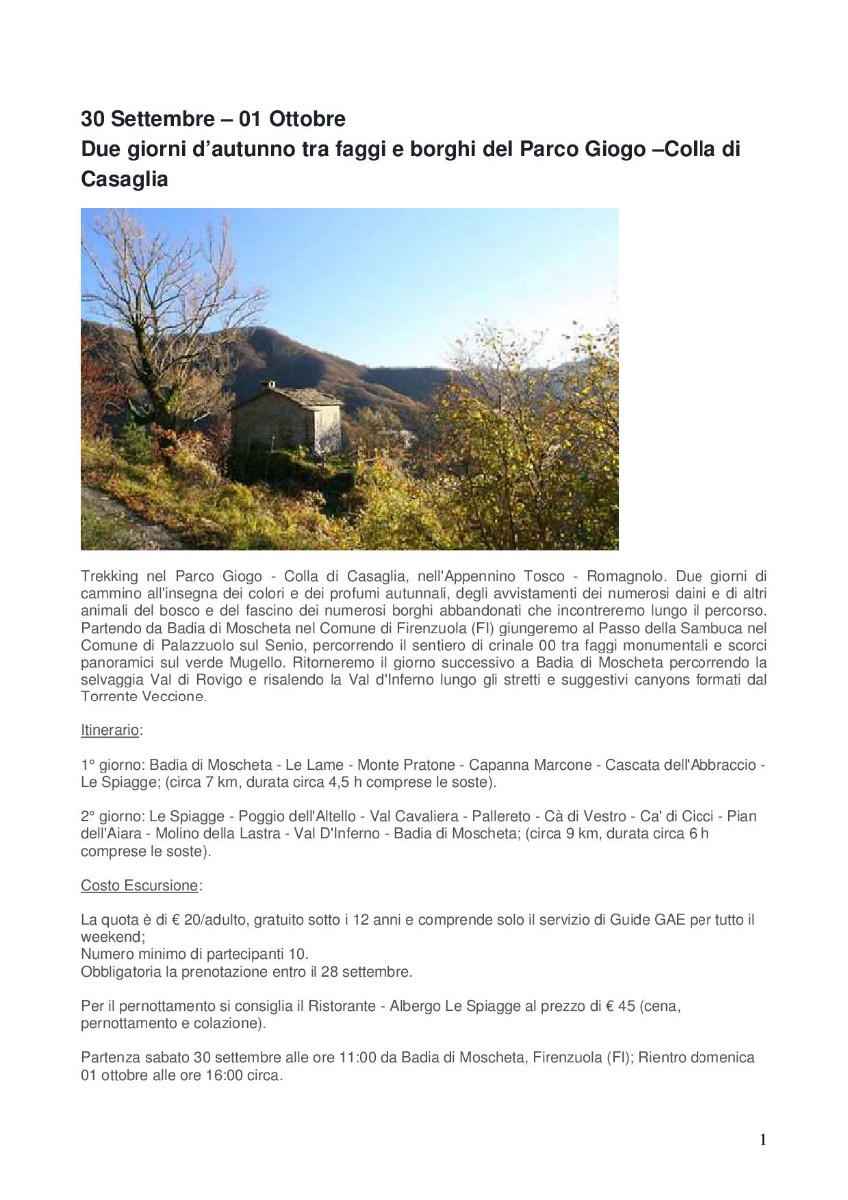 Due giorni d’autunno tra faggi e borghi del Parco Giogo –Colla di Casaglia Trekking nel Parco Giogo - Colla di Casaglia, nell'Appennino Tosco - Romagnolo. Due giorni di cammino all'insegna dei colori e dei profumi autunnali, degli avvistamenti dei numerosi daini e di altri animali del bosco e del fascino dei numerosi borghi abbandonati che incontreremo lungo il percorso.Partendo da Badia di Moscheta nel Comune di Firenzuola (FI) giungeremo al Passo della Sambuca nel Comune di Palazzuolo sul Senio, percorrendo il sentiero di crinale 00 tra faggi monumentali e scorci panoramici sul verde Mugello. Ritorneremo il giorno successivo a Badia di Moscheta percorrendo la selvaggia Val di Rovigo e risalendo la Val d'Inferno lungo gli stretti e suggestivi canyons formati dal Torrente Veccione.
