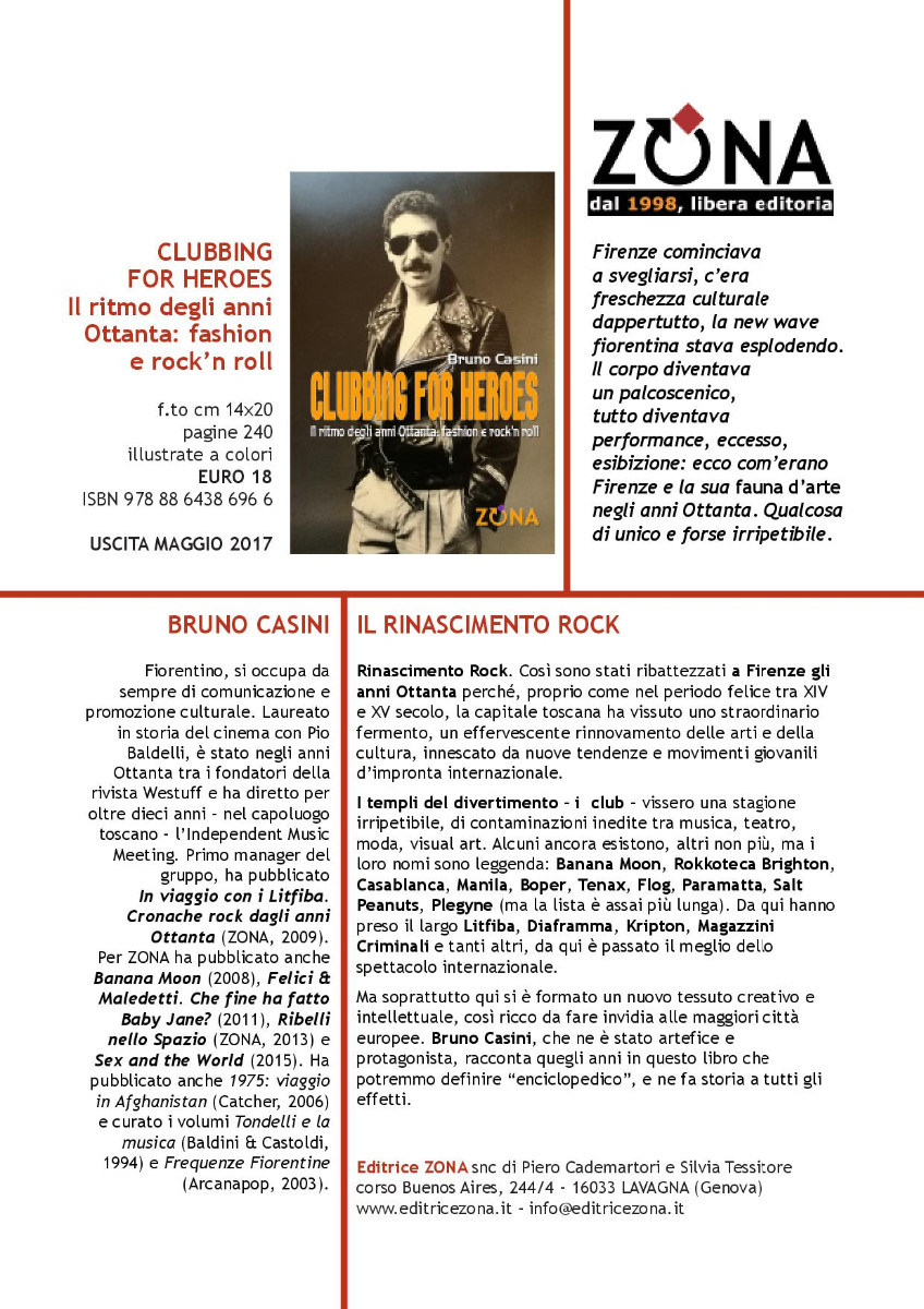 Il giorno successivo, Sabato 21 Aprile sempre alle 16, in Biblioteca arriva invece Bruno Casini con il suo "Clubbing for Heroes. Il ritmo degli anni ottanta. Fashion e rock'n roll" (Zona Editrice). Un'occasione per tutti gli amanti di musica per scoprire aneddoti e storie del cosiddetto "Rinascimento Rock". Così vennero ribattezzati a Firenze gli anni Ottanta perché, proprio come nel periodo felice tra XIV e XV secolo, la capitale toscana ha vissuto uno straordinario fermento, un effervescente rinnovamento delle arti e della cultura, innescato da nuove tendenze e movimenti giovanili d'impronta internazionale. Si parlerà così dei locali che fecero tendenza in quegli anni e dei gruppi che nacquero su quella spinta, dai Litfiba (di cui Bruno Casini fu il primo storico manager) ai Diaframma