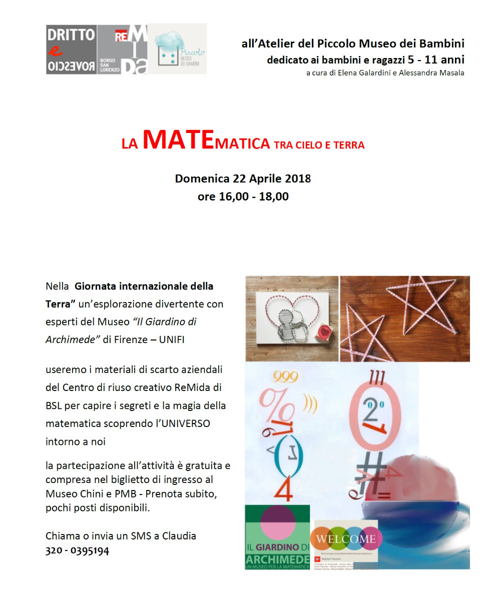 Si tratterà di un’esplorazione divertente con esperti del Museo “Il Giardino di Archimede” di Firenze – UNIFI. Verranno usati i materiali di scarto aziendali del Centro di riuso creativo ReMida di Borgo, per capire i segreti e la magia della matematica scoprendo l’UNIVERSO intorno a noi. La partecipazione all’attività è gratuita e compresa nel biglietto di ingresso al Piccolo Museo dei Bambini. È sufficiente prenotare chiamando o inviando un SMS a Claudia 320 - 0395194