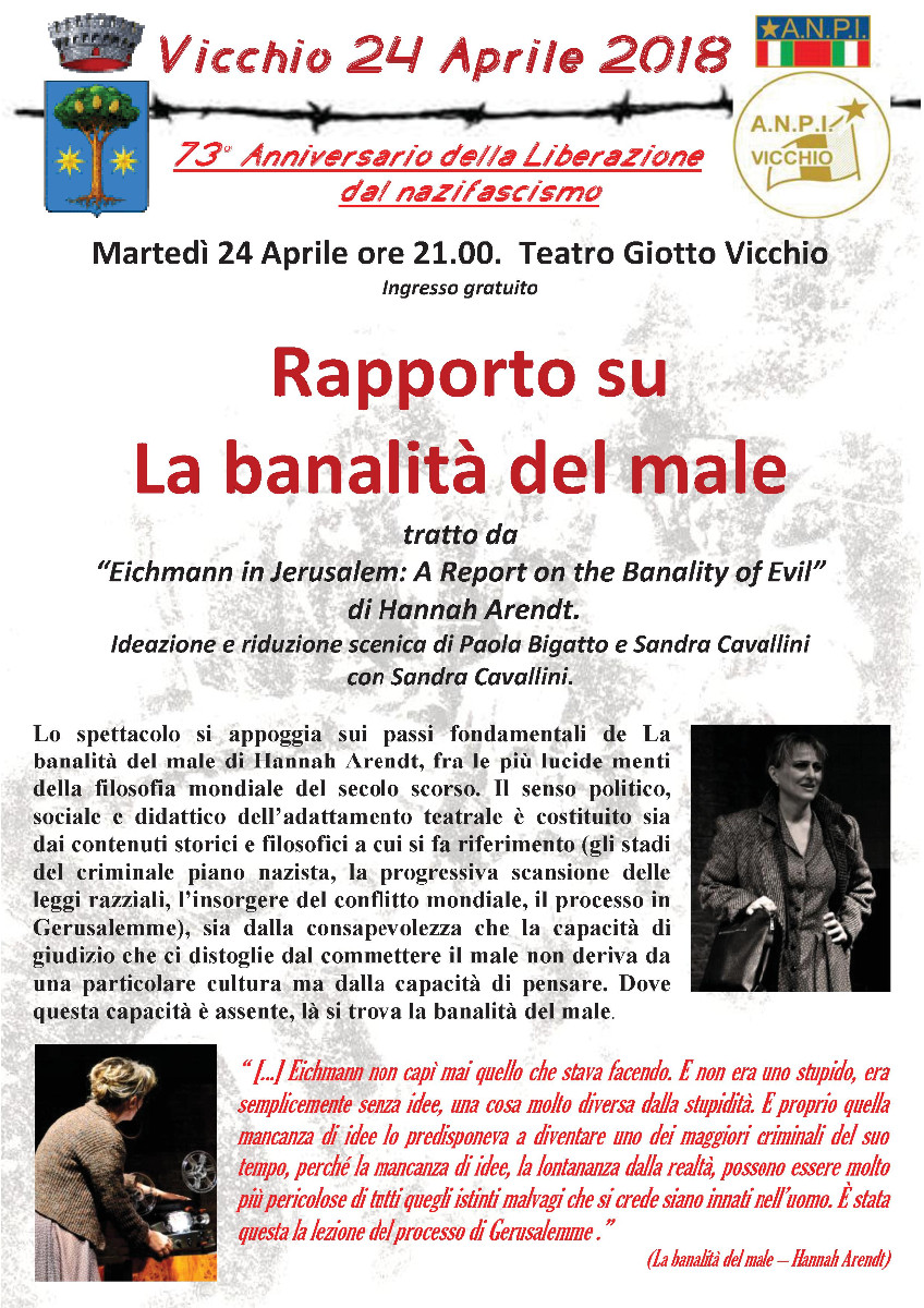 Lo spettacolo si appoggia sui passi fondamentali de La banalità del male di Hannah Arendt, fra le più lucide menti della filosofia mondiale del secolo scorso. Il senso politico, sociale e didattico dell’adattamento teatrale è costituito sia dai contenuti storici e filosofici a cui si fa riferimento (gli stadi del criminale piano nazista, la progressiva scansione delle leggi razziali, l’insorgere del conflitto mondiale, il processo in Gerusalemme), sia dalla consapevolezza che la capacità di giudizio che ci distoglie dal commettere il male non deriva da una particolare cultura ma dalla capacità di pensare. Dove questa capacità è assente, là si trova la banalità del male.