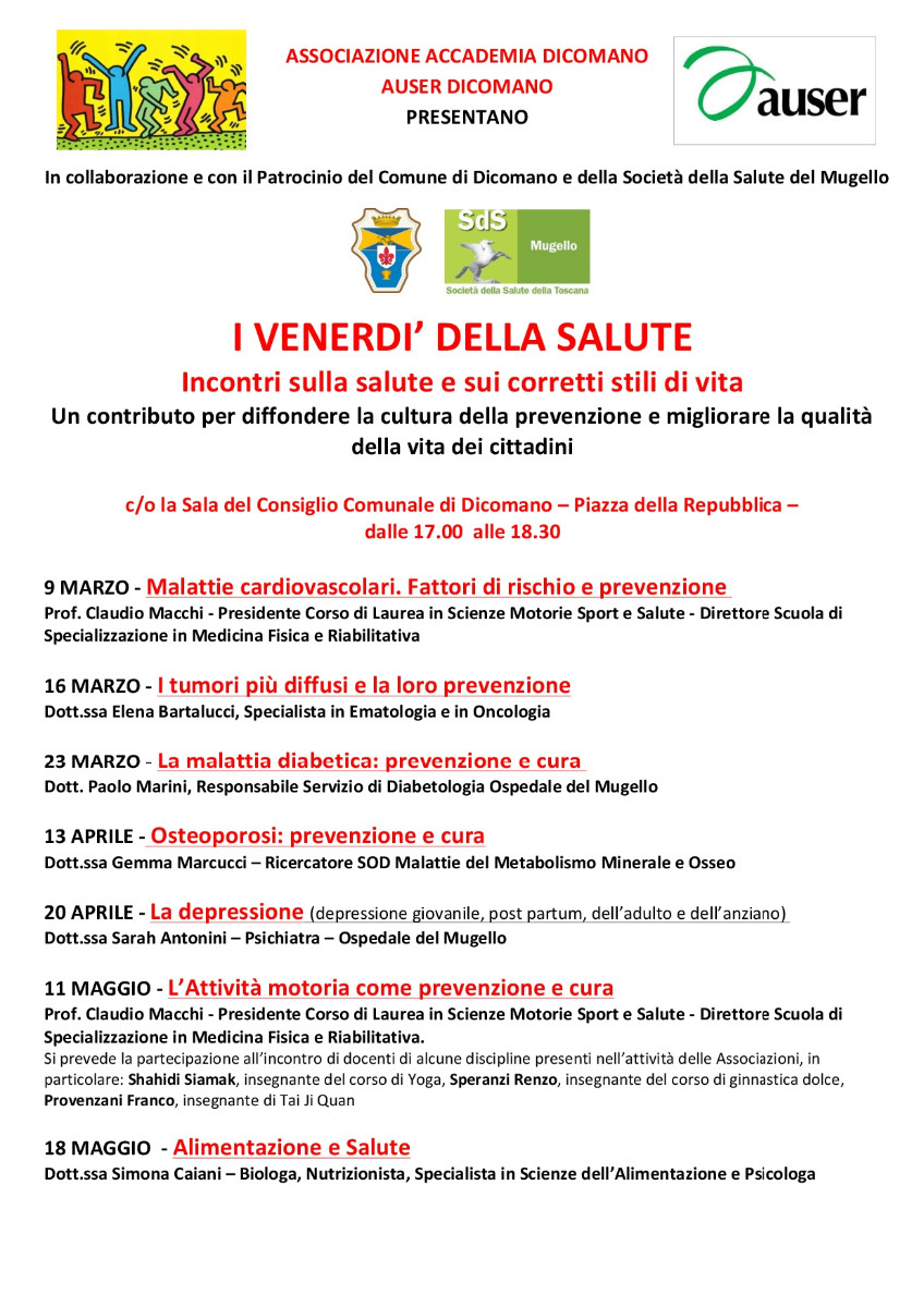 L'Associazioni Accademia della Cultura popolare e Auser Verde Argento con il patrocinio del Comune di Dicomano e della Sds Mugello organizzano una serie di incontri sulla salute per diffondere la cultura della prevenzione e migliorare la qualità della vita dei cittadini presso la Sala del Consiglio Comunale di Dicomano dalle 17.00 alle 18.30 nelle seguenti date: