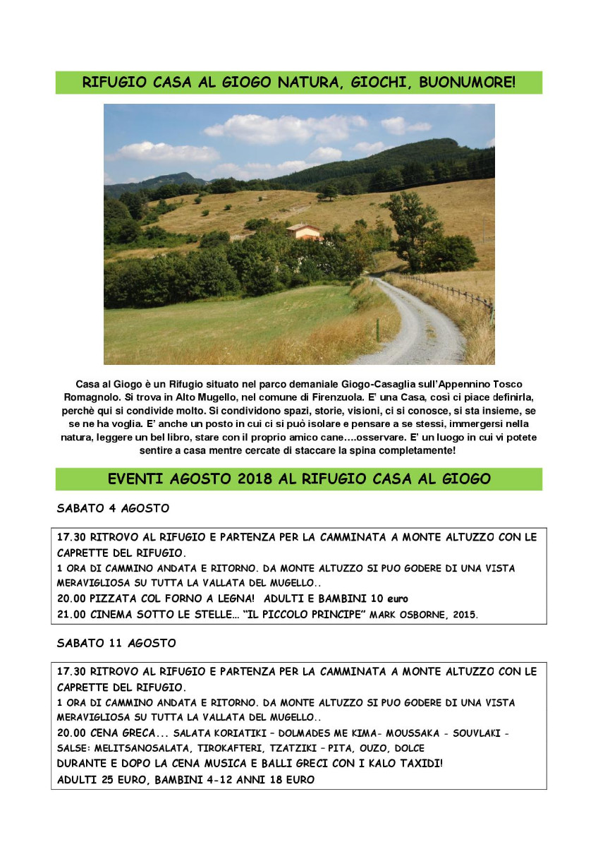 17.30 RITROVO AL RIFUGIO E PARTENZA PER LA CAMMINATA A MONTE ALTUZZO CON LE CAPRETTE DEL RIFUGIO. 1 ORA DI CAMMINO ANDATA E RITORNO. DA MONTE ALTUZZO SI PUO GODERE DI UNA VISTA MERAVIGLIOSA SU TUTTA LA VALLATA DEL MUGELLO.. 20.00 CENA GRECA... SALATA KORIATIKI – DOLMADES ME KIMA- MOUSSAKA - SOUVLAKI - SALSE: MELITSANOSALATA, TIROKAFTERI, TZATZIKI – PITA, OUZO, DOLCE DURANTE E DOPO LA CENA MUSICA E BALLI GRECI CON I KALO TAXIDI! ADULTI 25 EURO, BAMBINI 4-12 ANNI 18 EURO