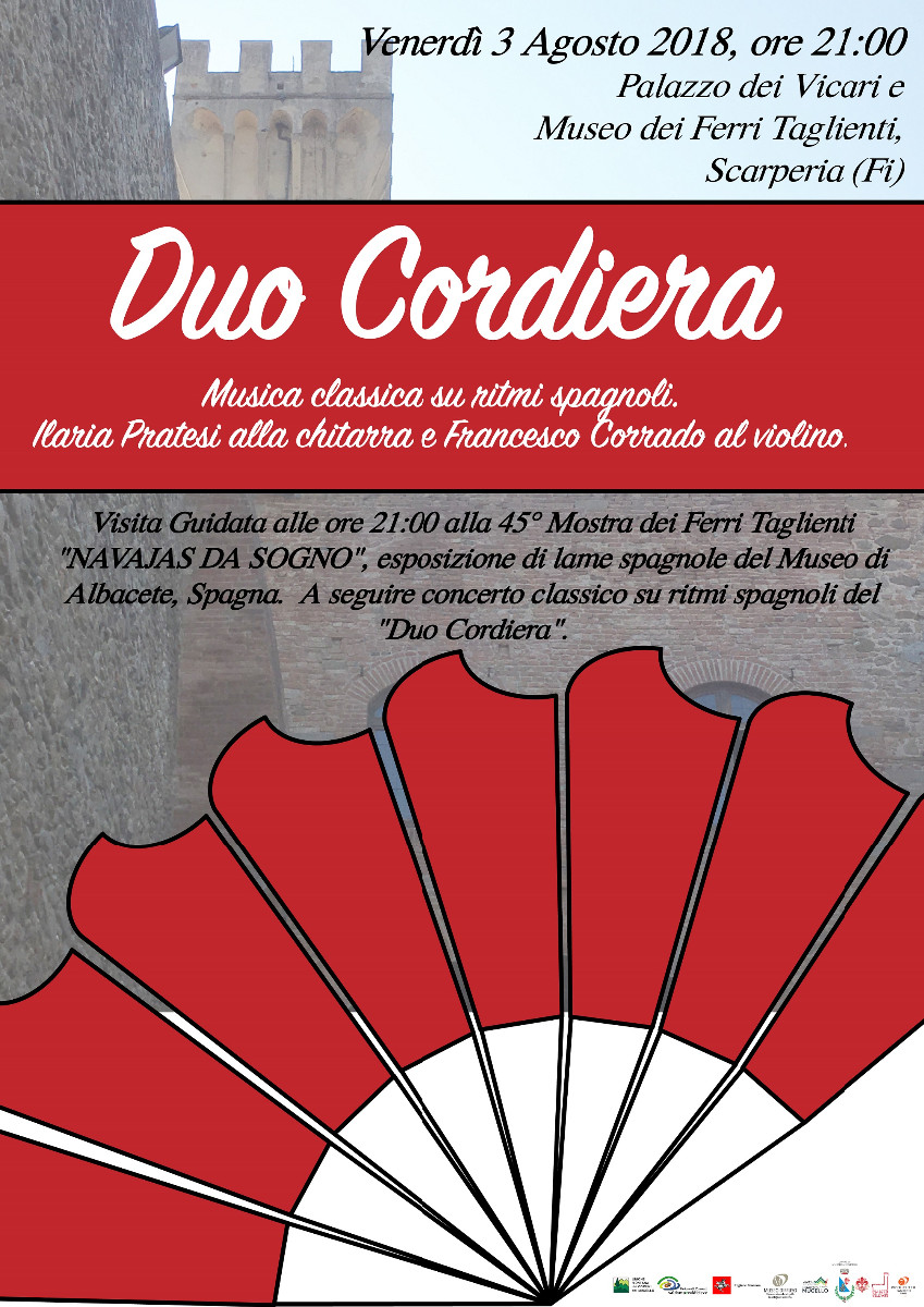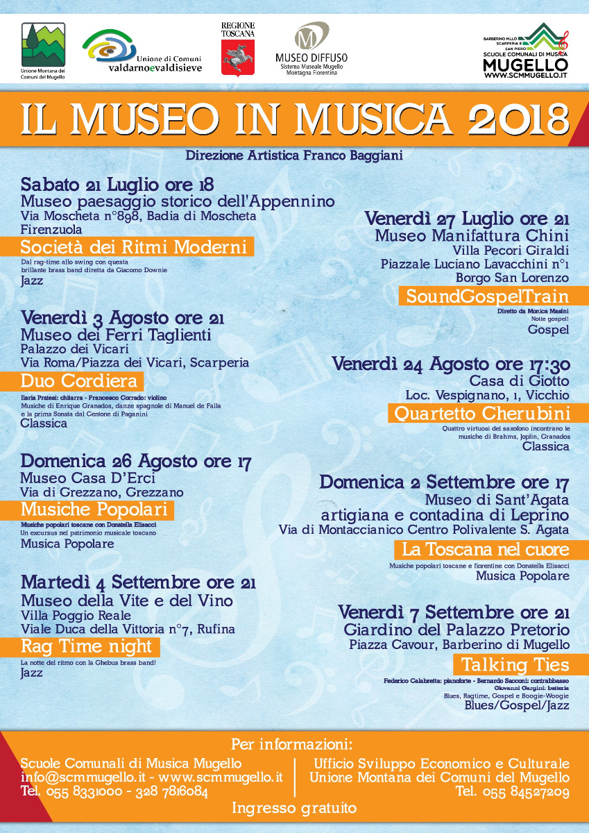 Venerdì 3 agosto alle ore 21 al Museo dei Ferri Taglienti (Palazzo dei Vicari) a Scarperia esibizione del “Duo Cordiera” in musica classica su ritmi spagnoli. Seguono nel mese di agosto: la musica classica del “Quartetto Cherubini” il 24 alle 17,30 al Museo Casa di Giotto (loc. Vespignano) a Vicchio e musiche popolari toscane il 26 alle 17 al Museo Casa d'Erci a Grezzano nel comune di Borgo.