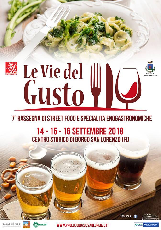 Borgo San Lorenzo si prepara alla settima edizione delle “Le Vie del Gusto” che da venerdì 14 a domenica 16 settembre trasformeranno il centro storico del capoluogo mugellano in un vero e proprio regno della gastronomia. Prodotti da acquistare, piatti da provare, occasioni per stare insieme e vivere le vie del centro storico come un vero e proprio ristorante a cielo aperto. L’iniziativa organizzata dalla Pro Loco di Borgo San Lorenzo, vanta diverse collaborazioni ed il patrocinio del Comune di Borgo San Lorenzo. Piazza del Popolo, Piazza Garibaldi, Via San Francesco, Via Pulci e Piazza Castelvecchio da venerdì, Via Mazzini, Piazza Cavour e Corso Matteotti da sabato, saranno il teatro di una tre giorni tutta da gustare.