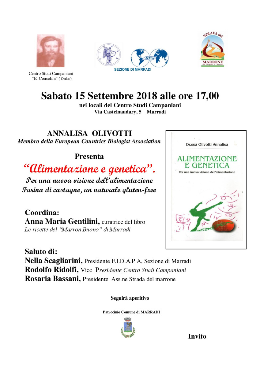 Presenta “Alimentazione e genetica”. Per una nuova visione dell’alimentazione. Farina di castagne, un naturale gluten-freeGentilini, curatrice del libro. Coordina: Anna Maria Gentilini, curatrice del libro. Le ricette del “Marron Buono” di Marradi